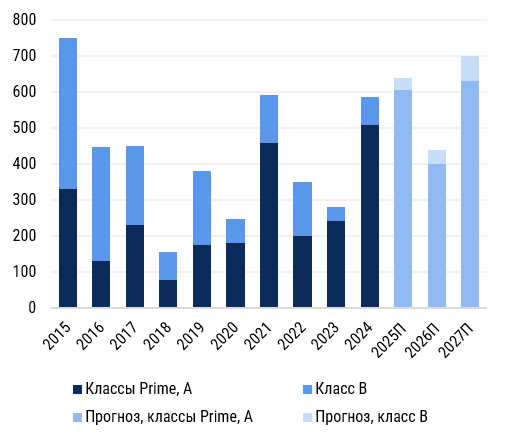 В 2026 году прогноз по новому строительству — 440 000 м². Несмотря на ожидаемое снижение ключевой ставки, влияние этого фактора будет отложенным. В 2027 году новое строительство может достичь 700 тыс. м², что будет свидетельствовать о поэтапном восстановлении рынка.