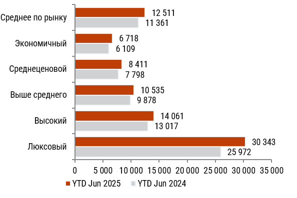 Хотя темпы прироста показателя Средней цены на номер для Рынка остались двузначными (+10,1% относительно 1 пол. 2024 г.), это стало возможным лишь за счет динамичного прироста тарифов в отелях Люксового сегмента (+16,8%). Остальные ценовые сегменты продолжают расти существенно медленнее (в среднем, на 8,1%), темпами, близкими к официальной инфляции или чуть выше нее.
